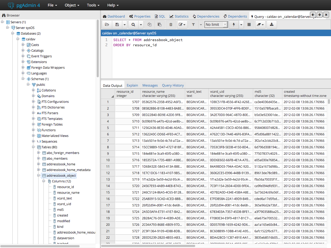 Now I am at the point where I have to decide what to do with the database’s content. It seems, the field „addressbook_home“ contains information of the users to connect to the service whereas „addressbook_object“ contains all the vCard information of the contacts?!