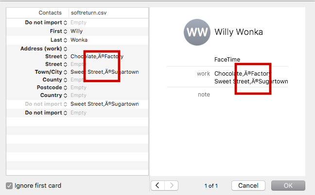 The script below will import this into Contacts, preserving the line returns.