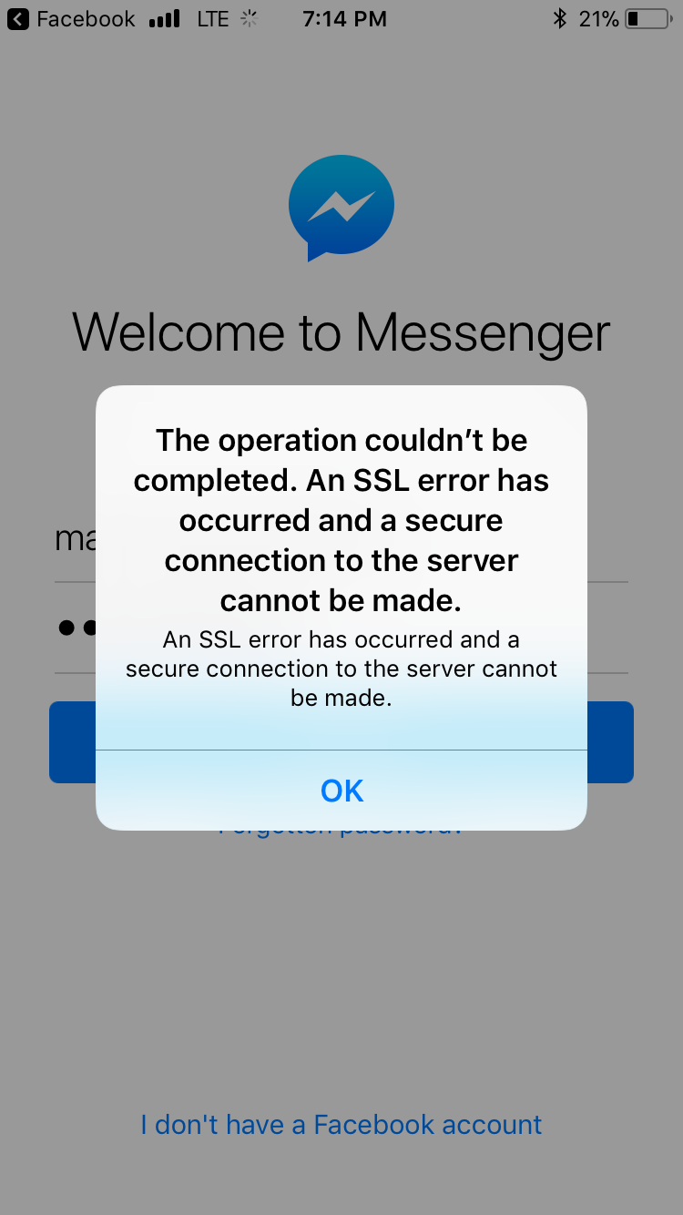 Hi, few days ago a Messenger (fb app) on my iPhone 6s, out of nowhere, stopped working. Everytime I wanna open the app it asks me about signing in the name and password, after I fill it in appears a problem that you can see in the pic below. I have the latest version of messenger and also of iOS - 11.1.2.