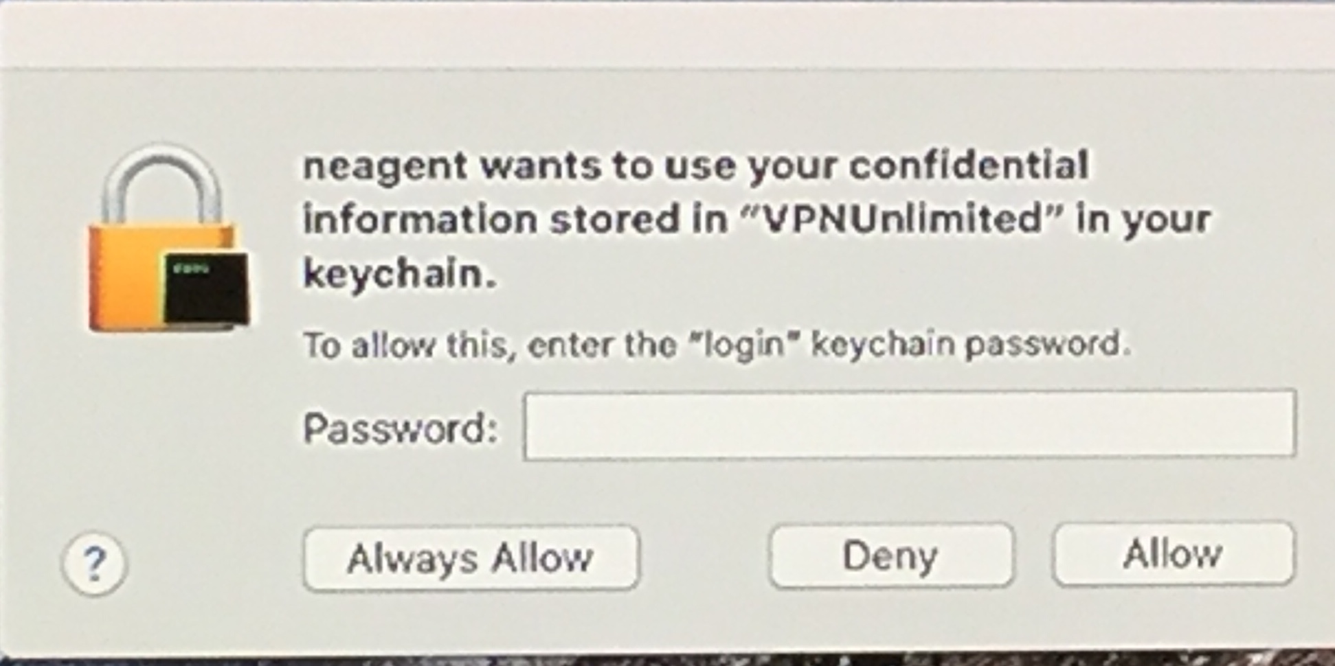 If you click Allow, the system will only save the password for the duration of a current session, and will request it again during reconnection. For your convenience, we recommend that you choose the Always Allow option. This way VPN Unlimited will remember your password and will not bother you with this notification again (until, of course, you decide to change the password).