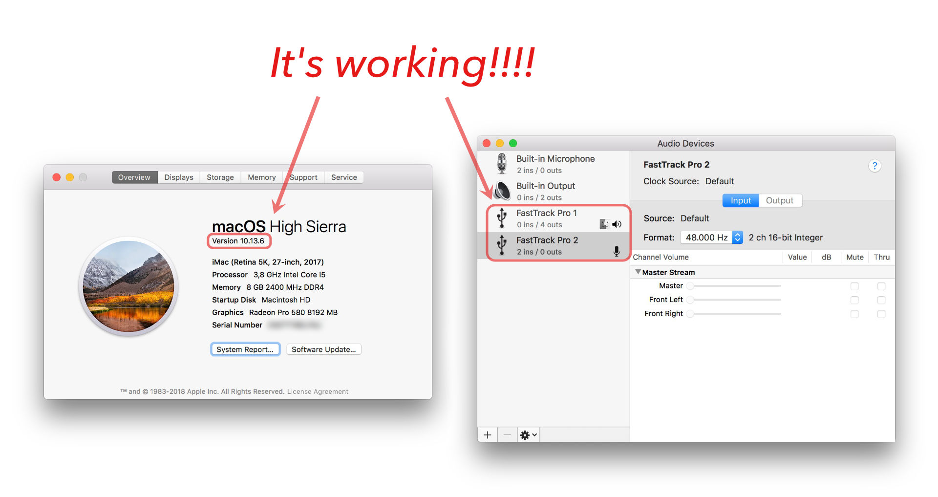 I'm using an external audio interface, "M-Audio Fast Track Pro", which was automatically recognized by the OS until now. After updating High Sierra to 10.13.2, which one of its improvements is about a best "compatibility with certain third-party USB audio devices", my iMac 27" Mid 2011 don't recognize the external audio interface at all!!!!