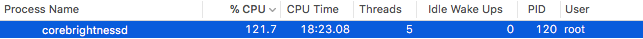 I was wondering why my Macbook Air was running at around 70+ ºC during idle, and i checked activity monitor, and well i saw that corebrightnessd was using at around 121% of the cpu. My laptop was at 69ºC and the fan at 5300rpm. I tried to quit the process but it kept on coming back then i opened the information tab and saw that kernal task(1) activated it and i quit that, and my laptop just restarted, what even is corebrightnessd, and why does it use over 100% CPU usage?