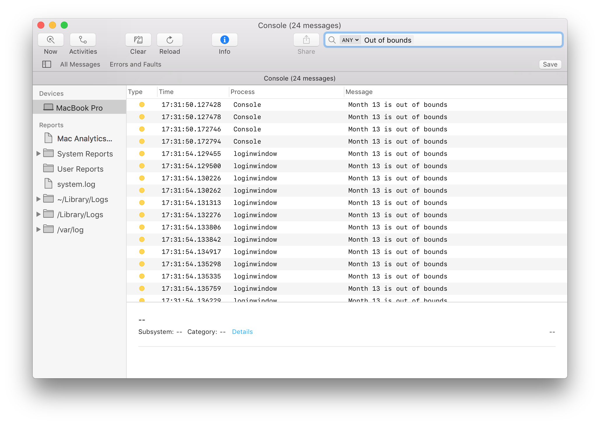 Below are 24 messages logged to the Console in just 4 seconds. Changing the date to November reportedly makes the error go away, so there seems to be a silly programming error that at some point makes December the 13th month. 😝