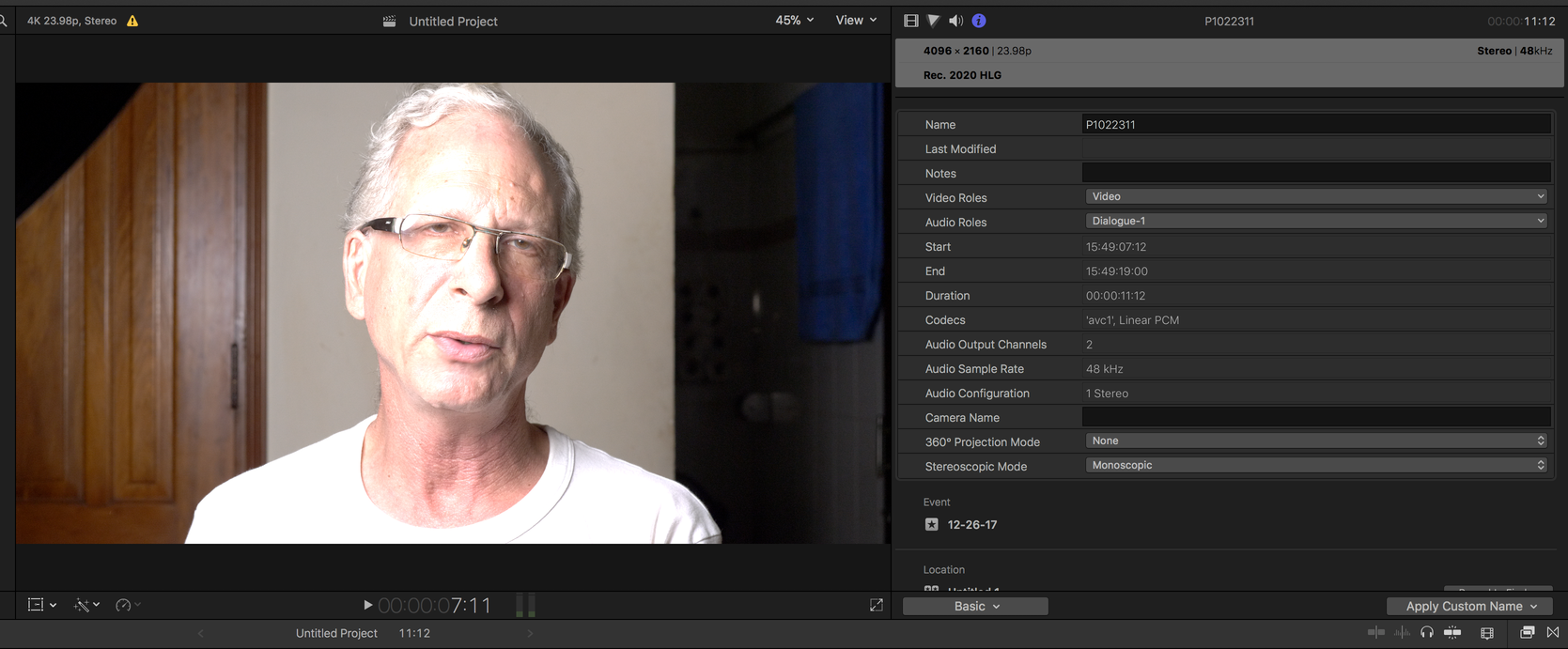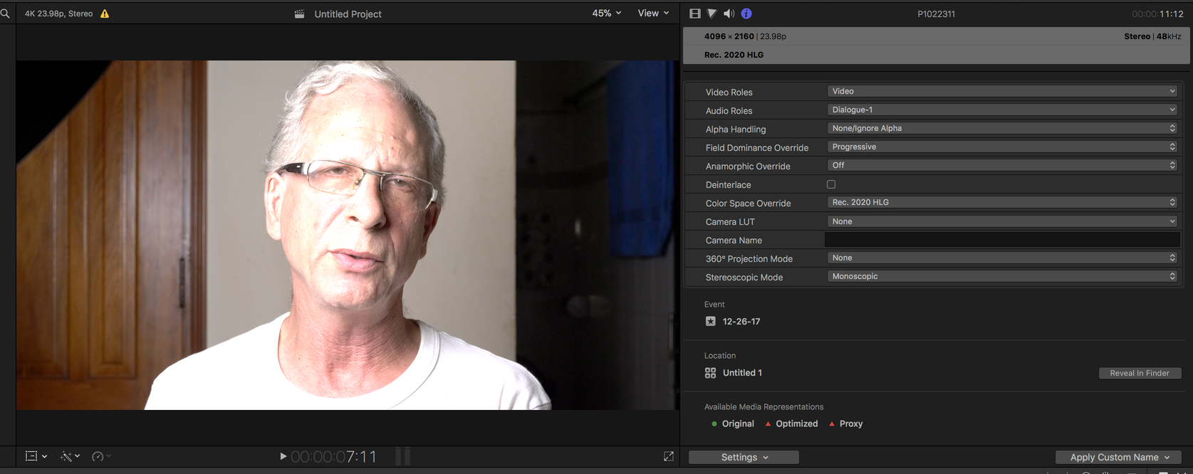 I want to edit a video shot in HLG in rec.709 for SDR delivery. I create a library, event and project and import my clips. I select the project and hit Control, Command, J and choose Standard Gamut in the pop-up window. In the Inspector, the project shows up as rec.709. So far, so good. But... the clips in the browser and timeline still show up as rec.2020. And because the clips in the timeline are too bright, I go into effects and apply HDR Tools. But the clips are still far too bright. In previous versions of FCP, the app applied tone mapping so I could view clips normally (when converted to rec.709 the HLG clips would take on a milky greyish appearance, after which I applied a LUT). In v.10.4, the clips are blown out, their appearance doesn't change, and I get a warning saying I need to connect an HDR monitor. Isn't there a way to view and edit the clips in the timeline as rec.709 without the correctly exposed clips showing up as two stops overexposed? Why are they still showing up as 2020? Thanks!