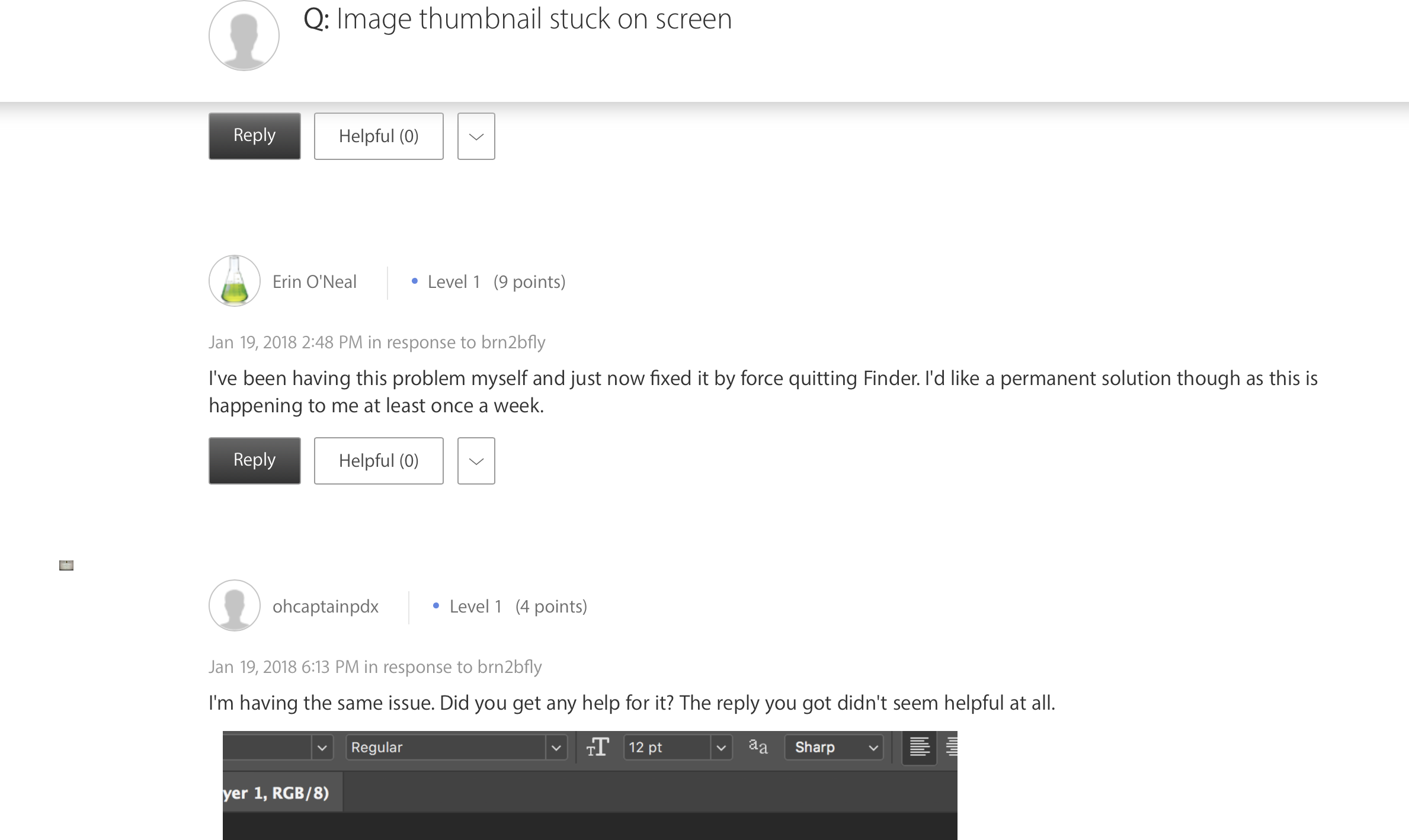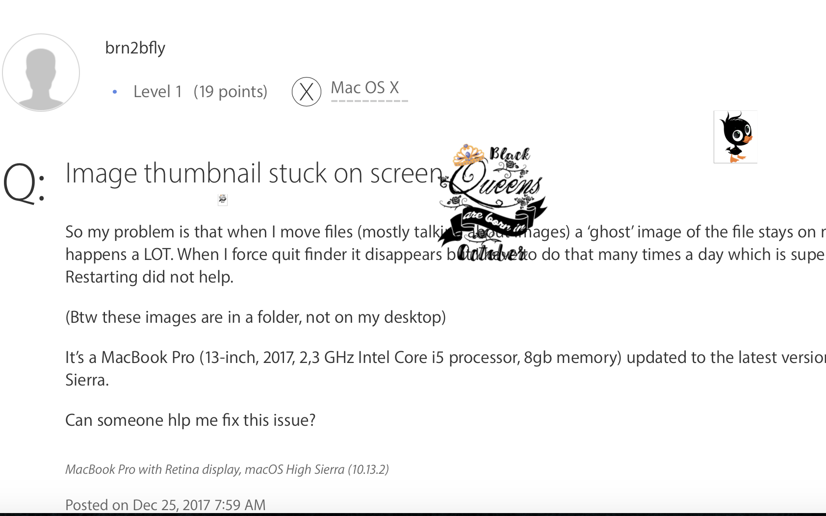 So my problem is that when I move files (mostly talking about images) a ‘ghost’ image of the file stays on my screen. This happens a LOT. When I force quit finder it disappears but I have to do that many times a day which is super annoying. Restarting did not help.