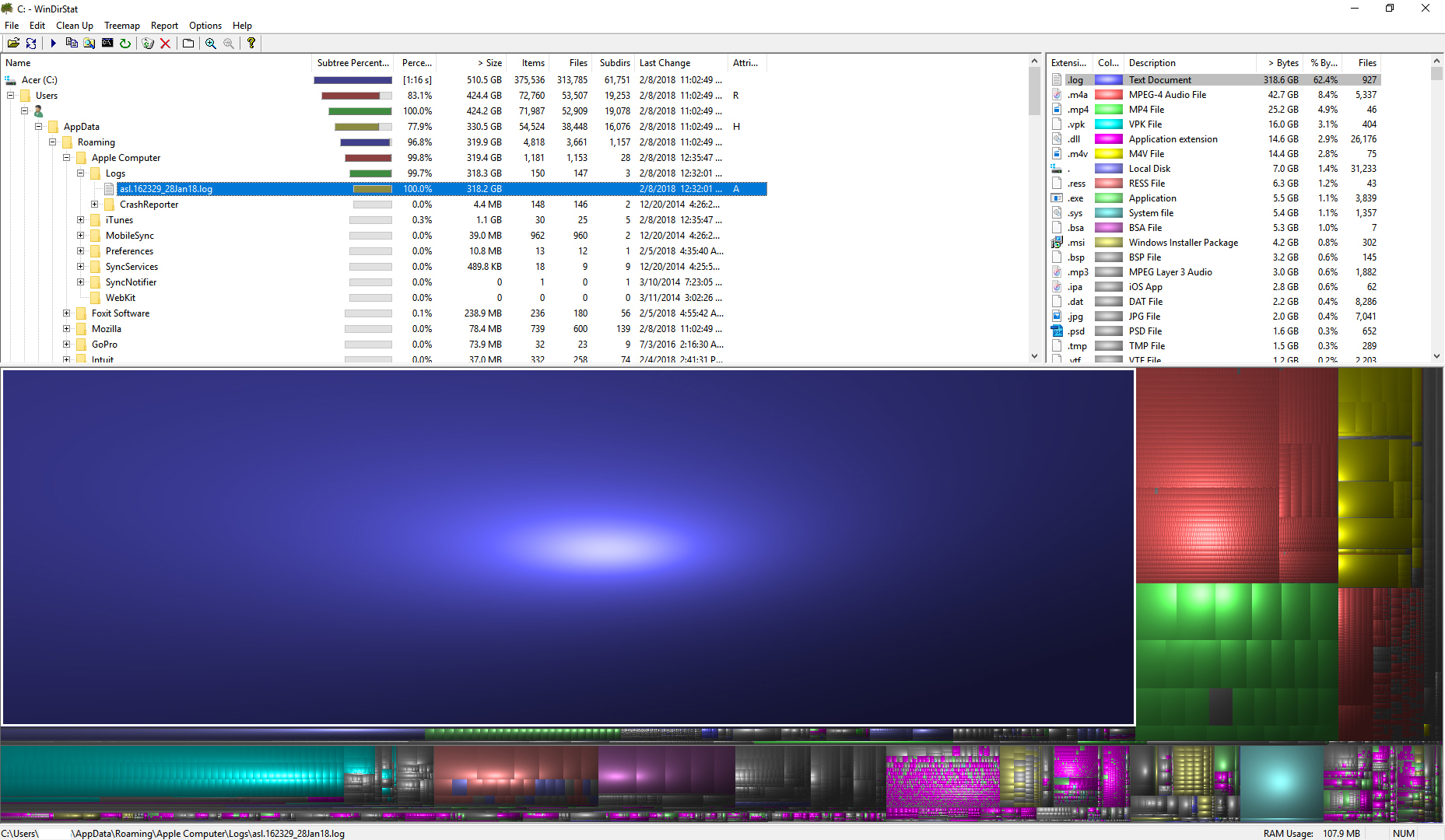 I deleted just enough space so I could download TreeSize to try and figure out WHAT it was that was taking up so much space only to find four log files under C:\Users\Micheoff\AppData\Roaming\Apple Computer\Logs that had accumulated 190 GB! One of them was 120 GB alone! I tried deleting all of them because I thought they were viruses disguised as Apple logs and three of them did, but one couldn't be deleted because of something called Distnoted.