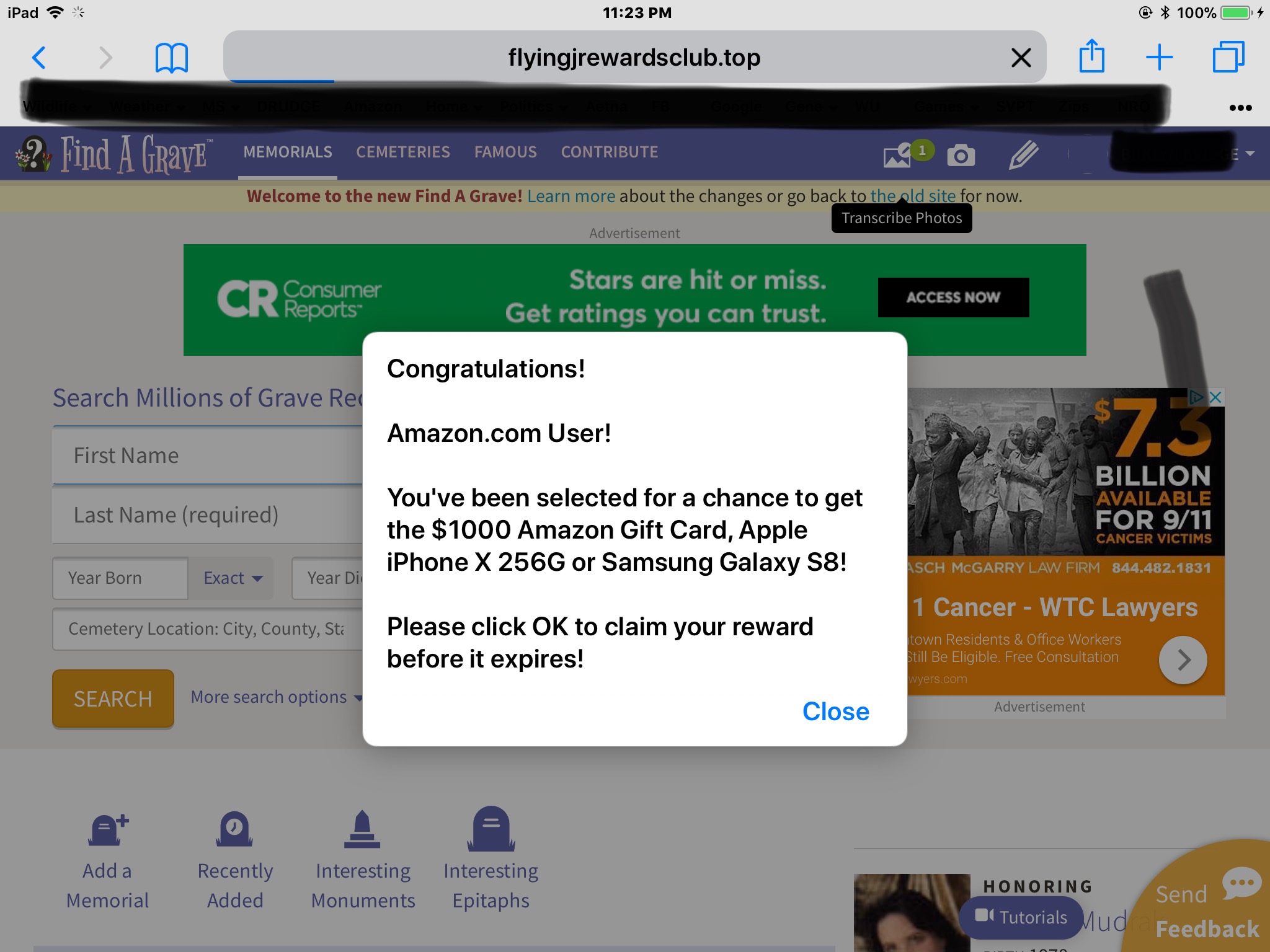 I was getting that pesky ‘Congratulations Amazon User’ on my iPad, too. It was driving me insane, showing up on multiple websites and making my iPad nearly unusable. But I solved it! First I deleted any Amazon apps - in my case, Amazon Music and Amazon Video. Next, I went to settings and cleared Safari‘s history. And then for good measure, downloaded the free Adblock app and activated ‘block popups’ Success! Hope this works for you.