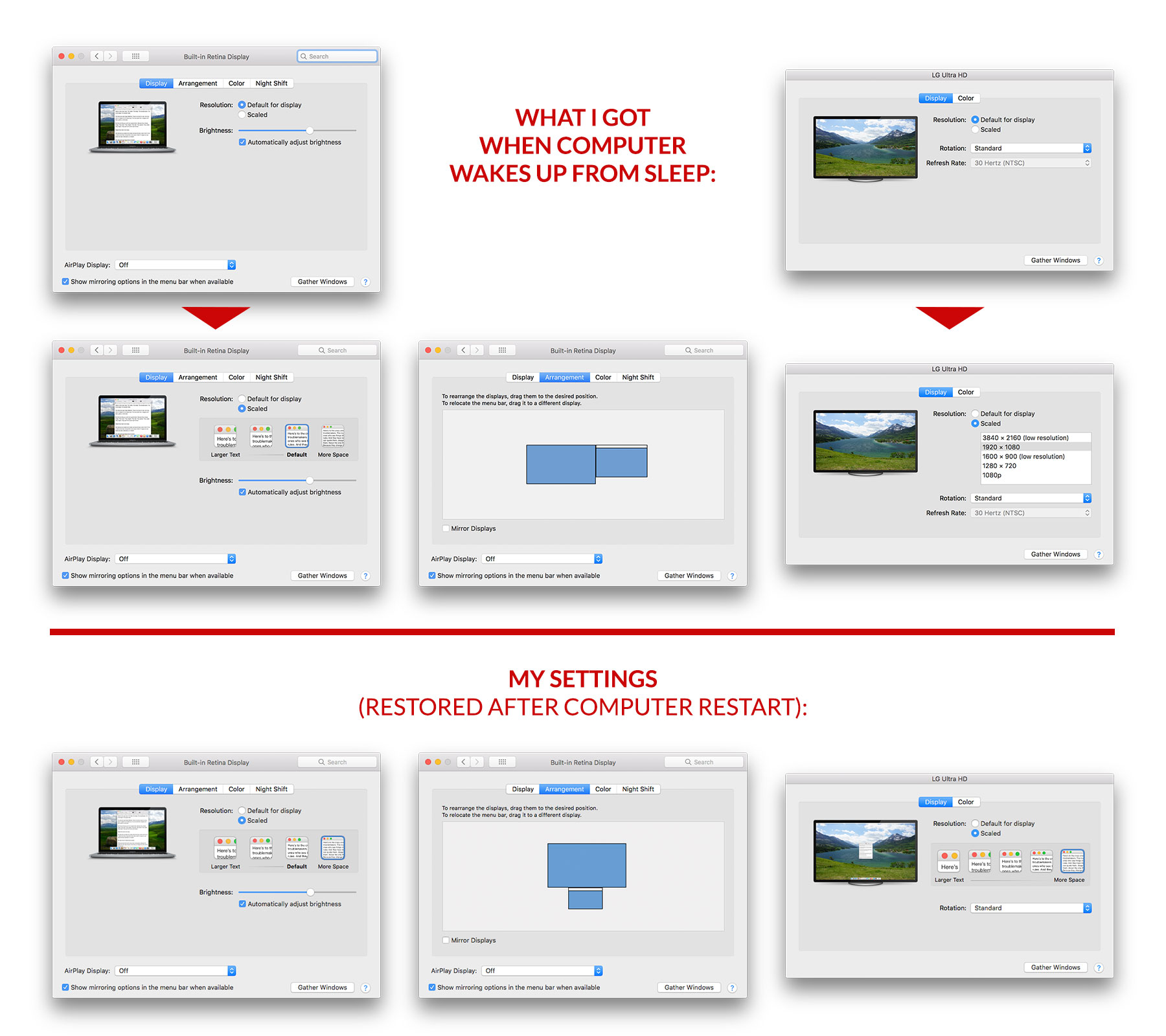 After my computer wakes up from sleep, those settings are lost. Both displays are set to "default for display" resolutions which are "like 1440x900" for the built-in display and 1920x1080 for external display. Screens are also arranged side-by-side. Moreover, external display settings window looks different: instead of those little icons placed on "Larger Text - More Space" scale, I have just a standard list of resolutions.