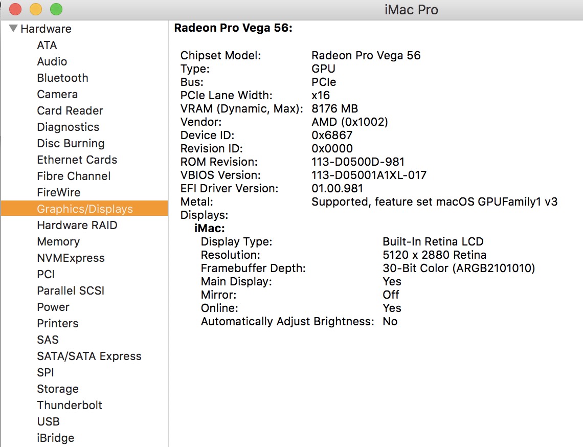 Graphics: Radeon Pro Vega 64, Radeon Pro Vega 64, PCIe, 16 GB