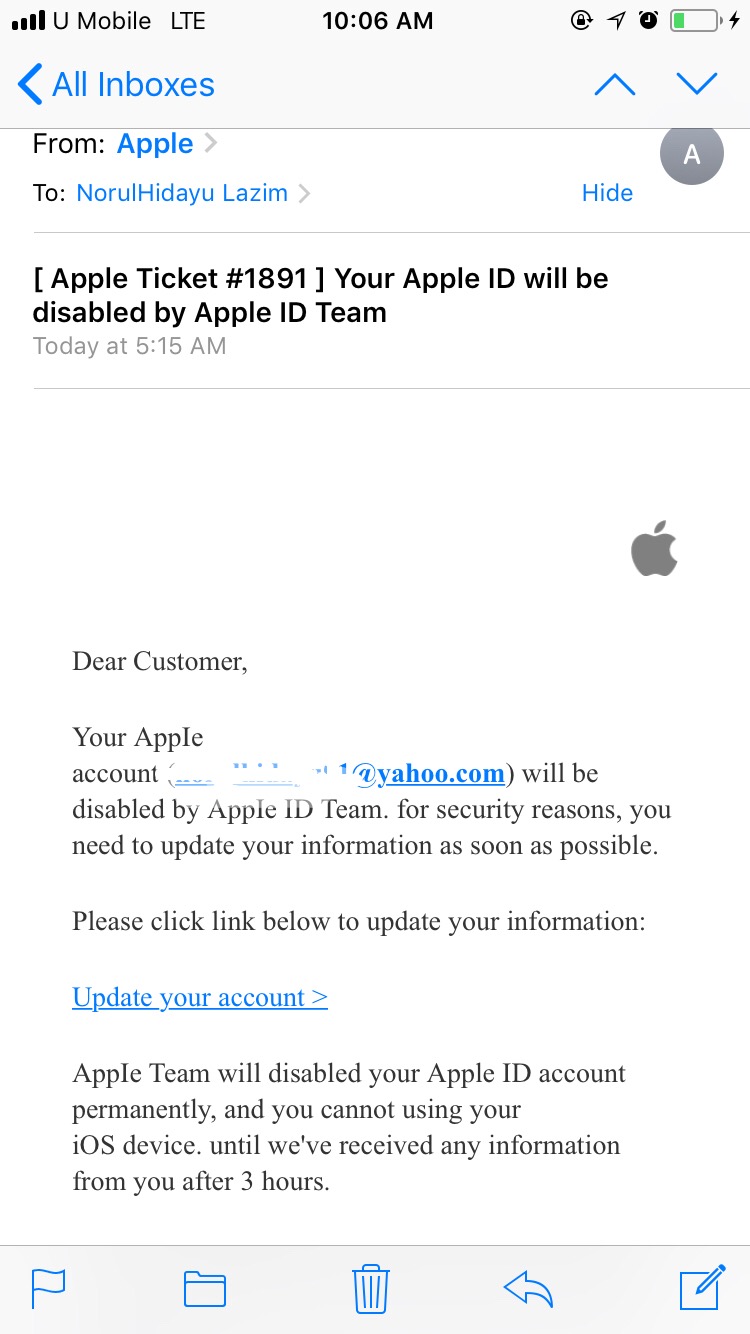 Hi. I just get an email this morning. As stated, it from Apple support and the email tells me to update my apple id or they will disable my account in 3 hours? Does it a spam? Here i attached the email content.
