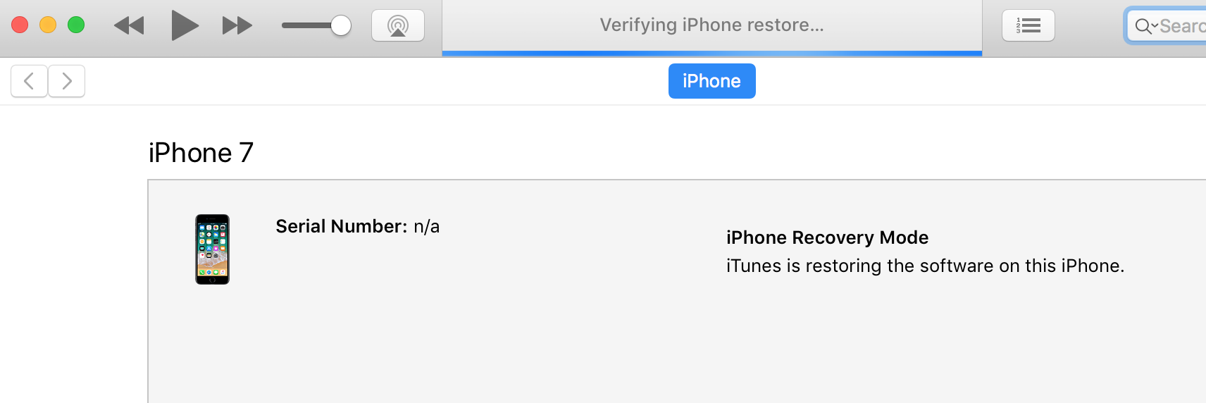 iTunes told me it was "Verifying iPhone restore" and the iPhone 7 screen came to life! Only problem is, it was stuck that way for the longest time. I waited over night and the progress bar on the iPhone screen never moved (see screenshots)