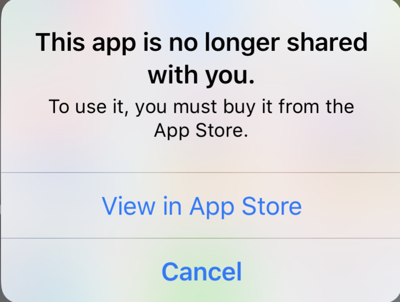 My wife is trying to use one app that I have already purchased. When she does, she gets the message "This app is no longer shared with you. To use it you must buy it from the App Store". If she attempts to go buy it in the app store, after doing all the credentials stuff, it says something like "This app has already been purchased by some one in the family", but you can re-download it from the App store. When she does the, it works fine "for a little while". Sometime from 1 day to a week later, the cycle begins again.
