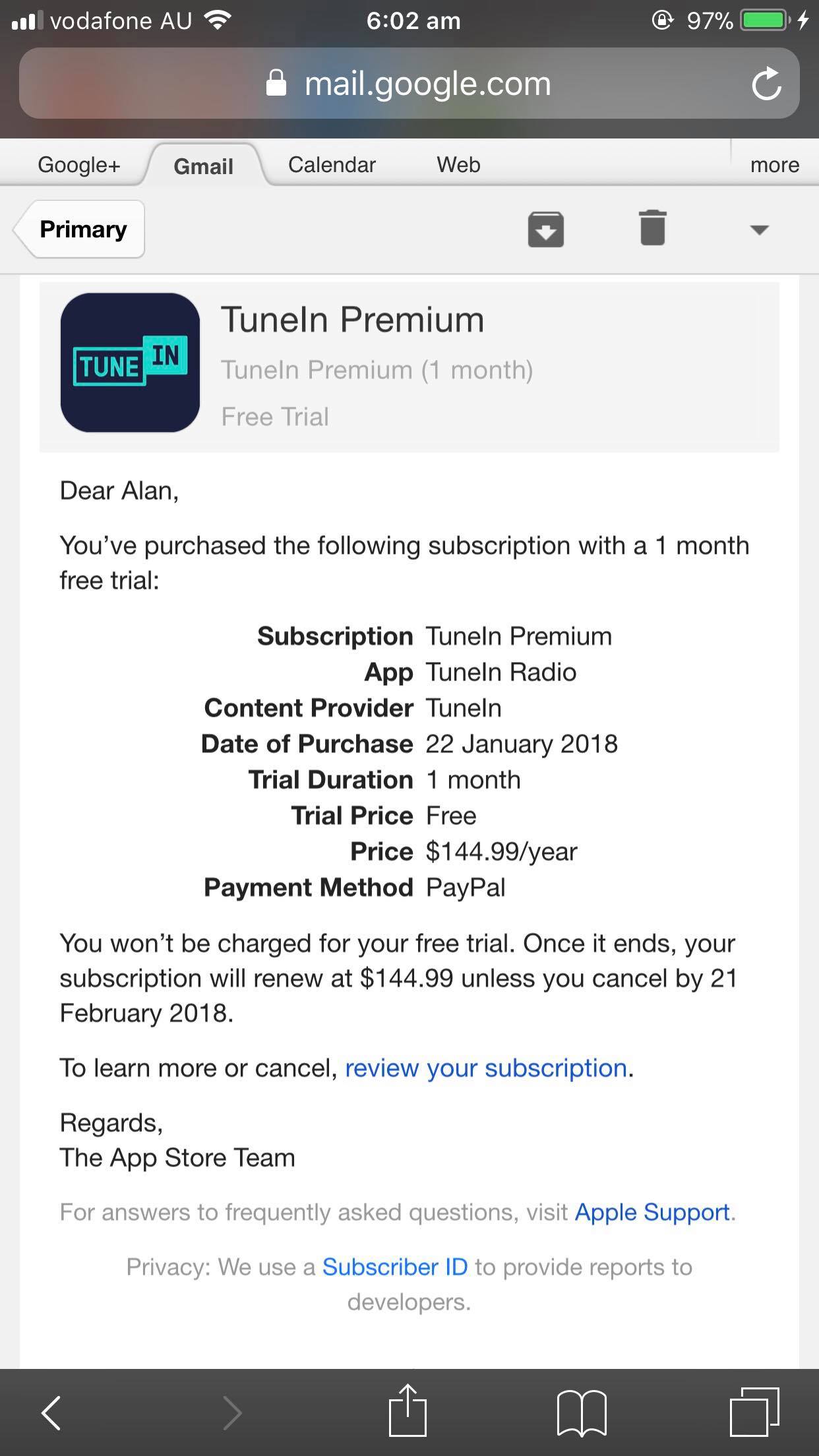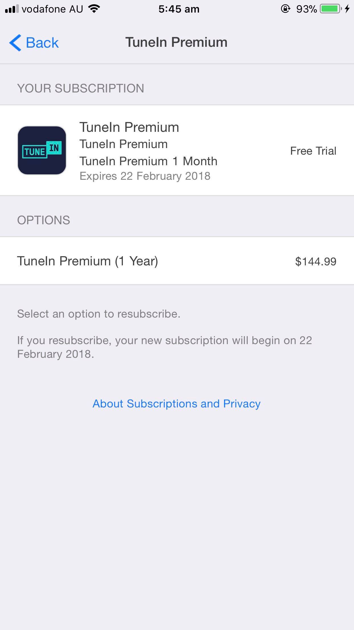 I recently installed the TuneIn radio app and accidentally signed up for a 1 year premium subscription with 1 month free trial as I had Touch ID enabled. What I want to know is if I've successfully cancelled the subscription and prevented the charge of $144.99 from occurring after this free trial ending on the 22nd of February?