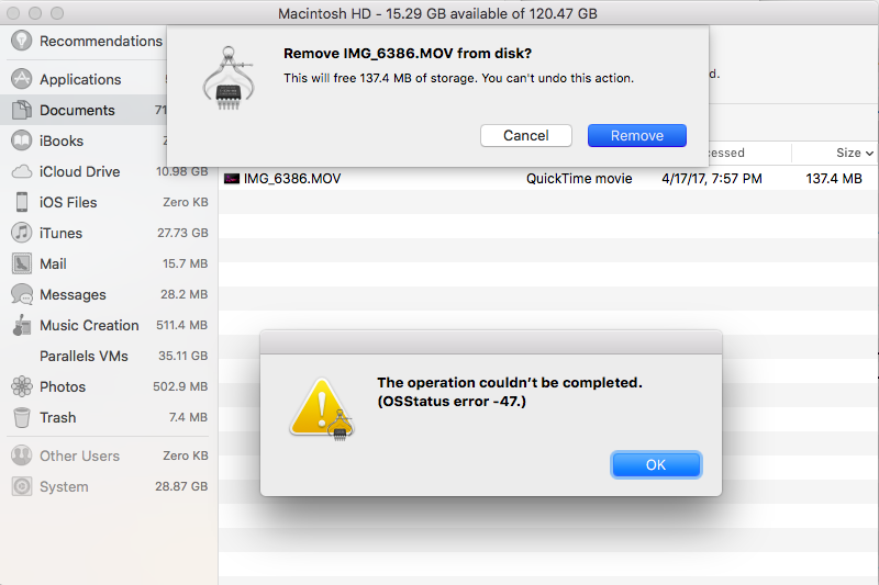 I am trying to delete a .MOV file from my Mac, It was a quicktime file last accessed about a year ago. I had many other quick time files I was able to delete but this one keeps giving me a error. How can I delete this file and what does the error message mean? see attached screenshot