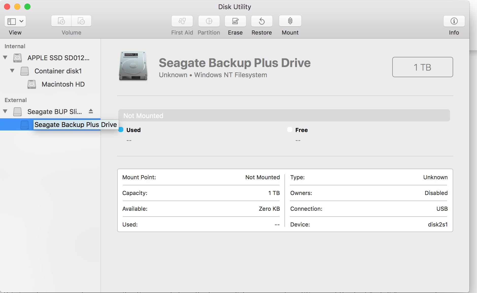 I have a 2014 macbook pro that I recently updated to High Sierra. Ever since the update I have been unable to mount my Seagate Backup Plus Drive. I've tried restarting multiple times, connecting to other computers (which does work, they all mount it just fine) and checking Disk Utility. The drive shows up greyed-out in Disk Utility, pressing mount doesn't do anything. I'm at a loss. I believe it's a problem with my computer and not the drive, since the drive mounts to all other computers I've tried. Any help would be really appreciated