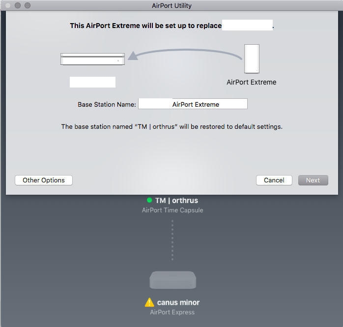 i couldn’t set it up because i got the prompts i posted saying that it wanted to replace my time capsule device (hard drive and wifi) and i have a time machine backup on the thing i don’t want to mess with.