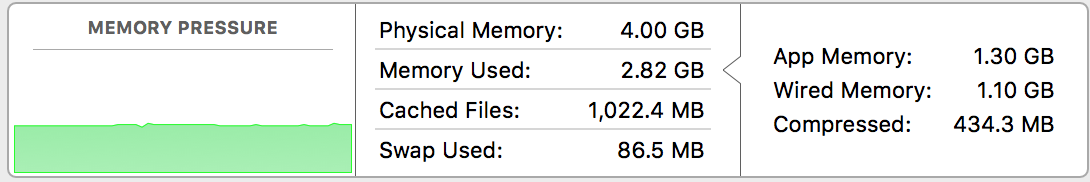 This computer has 4GB of hardware RAM. IN THIS EXAMPLE, how much of that 4GB is being used? To me, the term "Wired Memory" suggests that that is the figure but "Memory Used" is 2.82G. What is Wired Memory? What is App Memory (with this confusion I'm not about to make an assumption)? What is Compressed Memory? Why is it that App Memory plus Wired Memory plus Compressed does not exactly equal Memory Used?