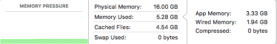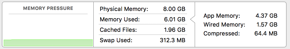 Unfortunately, when I go to the bottom of the screen, the summary information contradicts my belief and adds an additional confusing factor. App Memory + Wired Memory + Compressed = Memory Used (approximately).
