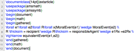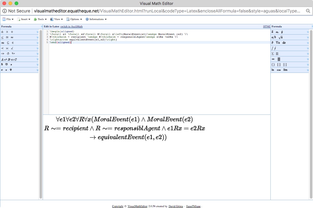 I'm writing a paper with some logical formulas. The default way to do this now in pages is to insert LaTex code. I've never liked LaTex, I'm lazy and like WYSIWYG editors. I found this nice little tool on the web called Visual Math Editor: http://visualmatheditor.equatheque.net/ And I used it and got the first formula looking the way I wanted In the tool it looks great. I've included a screen snapshot below. And the actual code I'm using is: