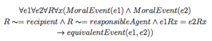 \forall e1 \forall e2\forall R\forall x\left(MoralEvent(e1)\wedge MoralEvent (e2) \\