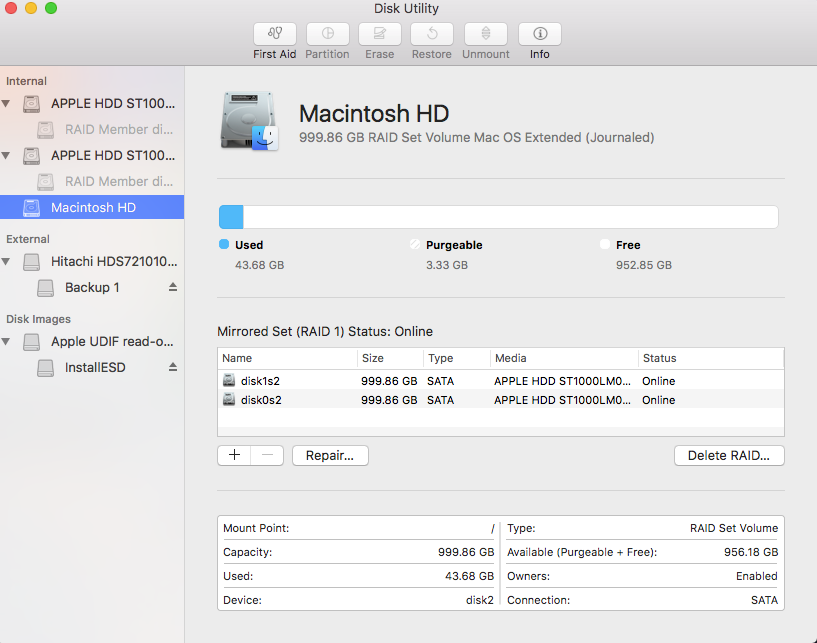 Yes, the display is similar to your Disk Utility example except each HD in the RAID array takes up all the available space although the overall system depicted as Macintosh HD shows lots of free space since that depicts the actual content rather than ownership. As I noted in my previous post the error message is: Can't unmount RAID set 1F8..... to delete it.