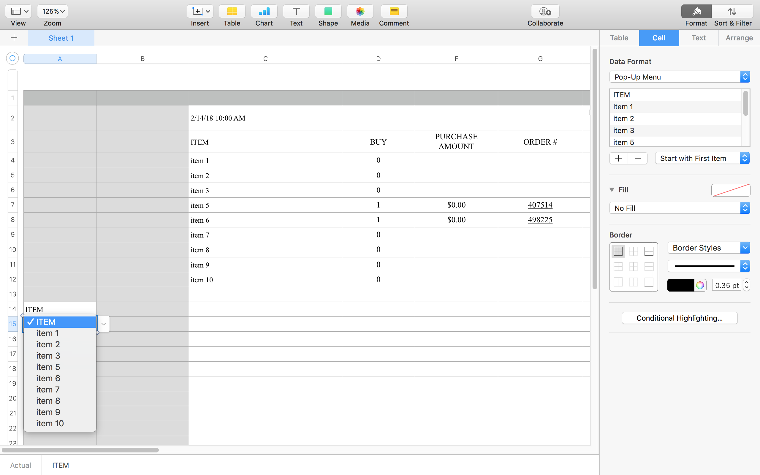In the example are two pop-up cells: A14 and A15 representing the makings of a potential purchase order.