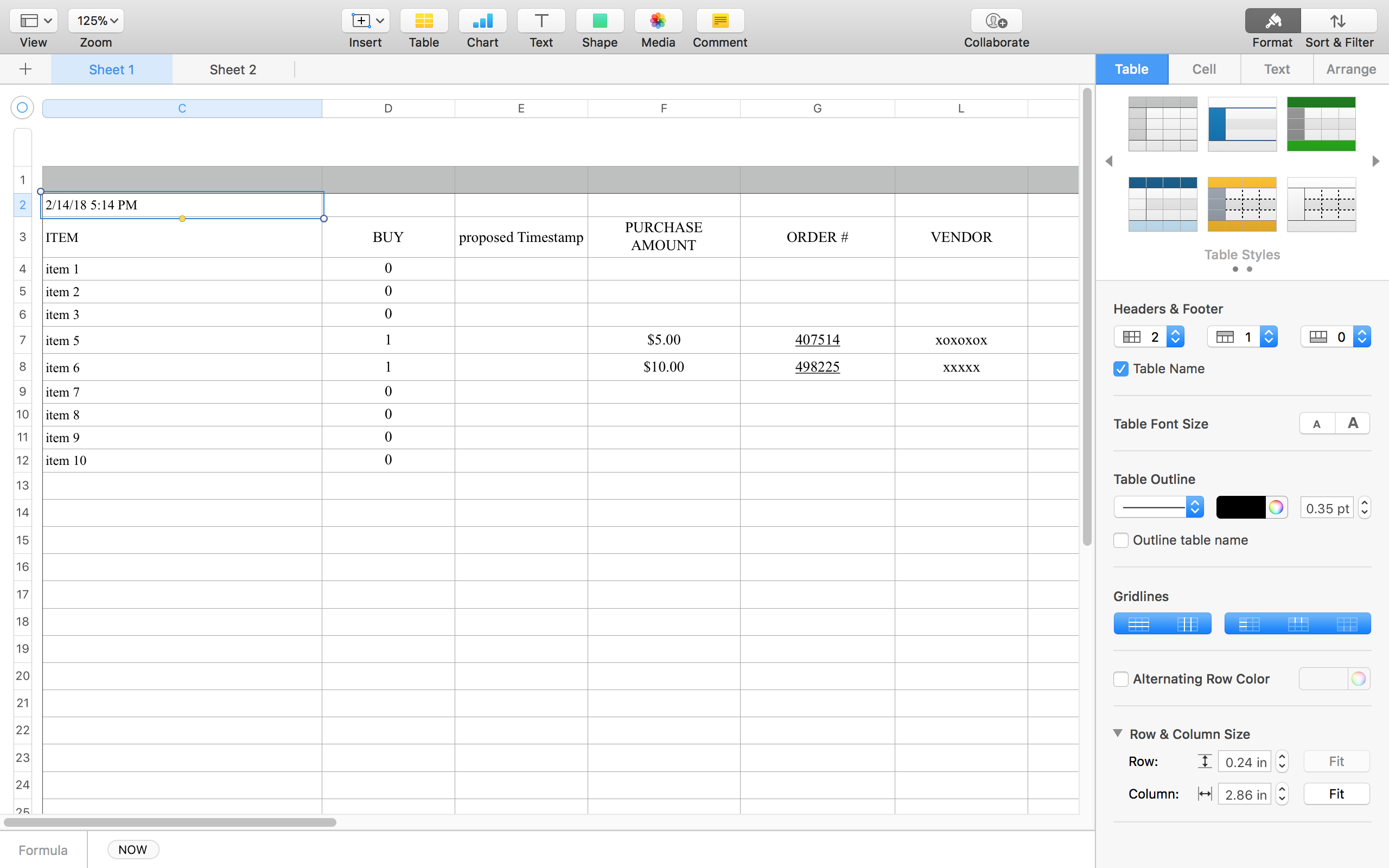 The way it is now, a user is able to change the quantity in sheet 1 and formulas result in populating the purchase amount, order# and vendor by finding the least expensive. My objective is for sheet 2 to call these as well as the item description and quantity, from sheet 1. Where I’m at a total loss is to get the PO to condense and negate the rows of items that are not being ordered. I decided (while obviously not being schooled) that the pop-ups are my solution.
