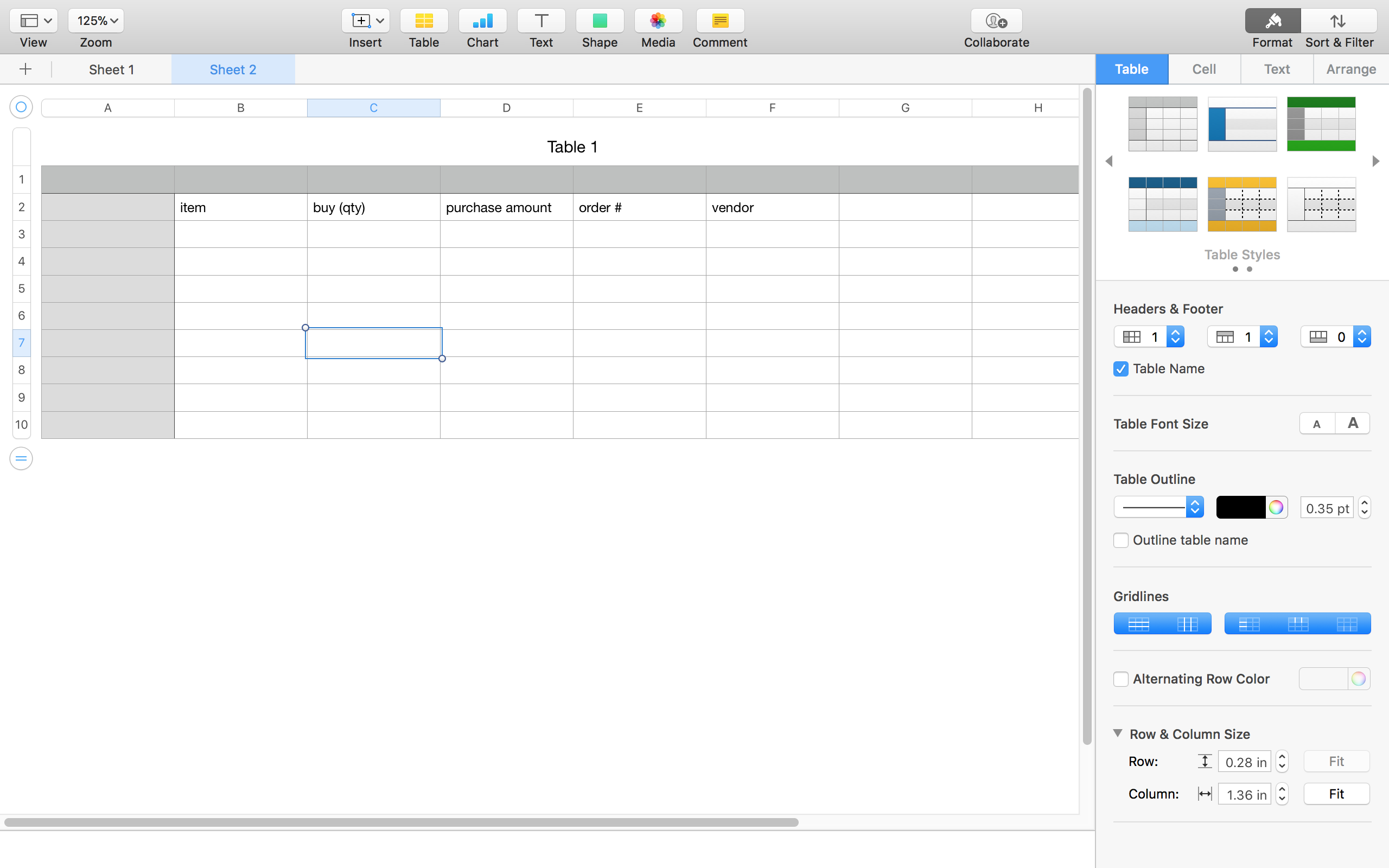 Sheet 2 contains a single table which we'll name PO (as in Purchase Order).