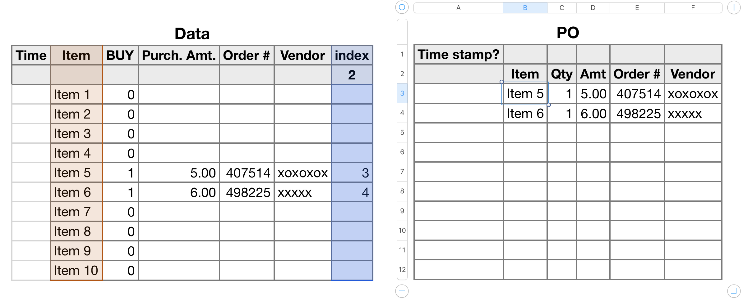 The PO (Purchase Order is a simple list of data from the rows marked by the index formula above as 'of interest.'