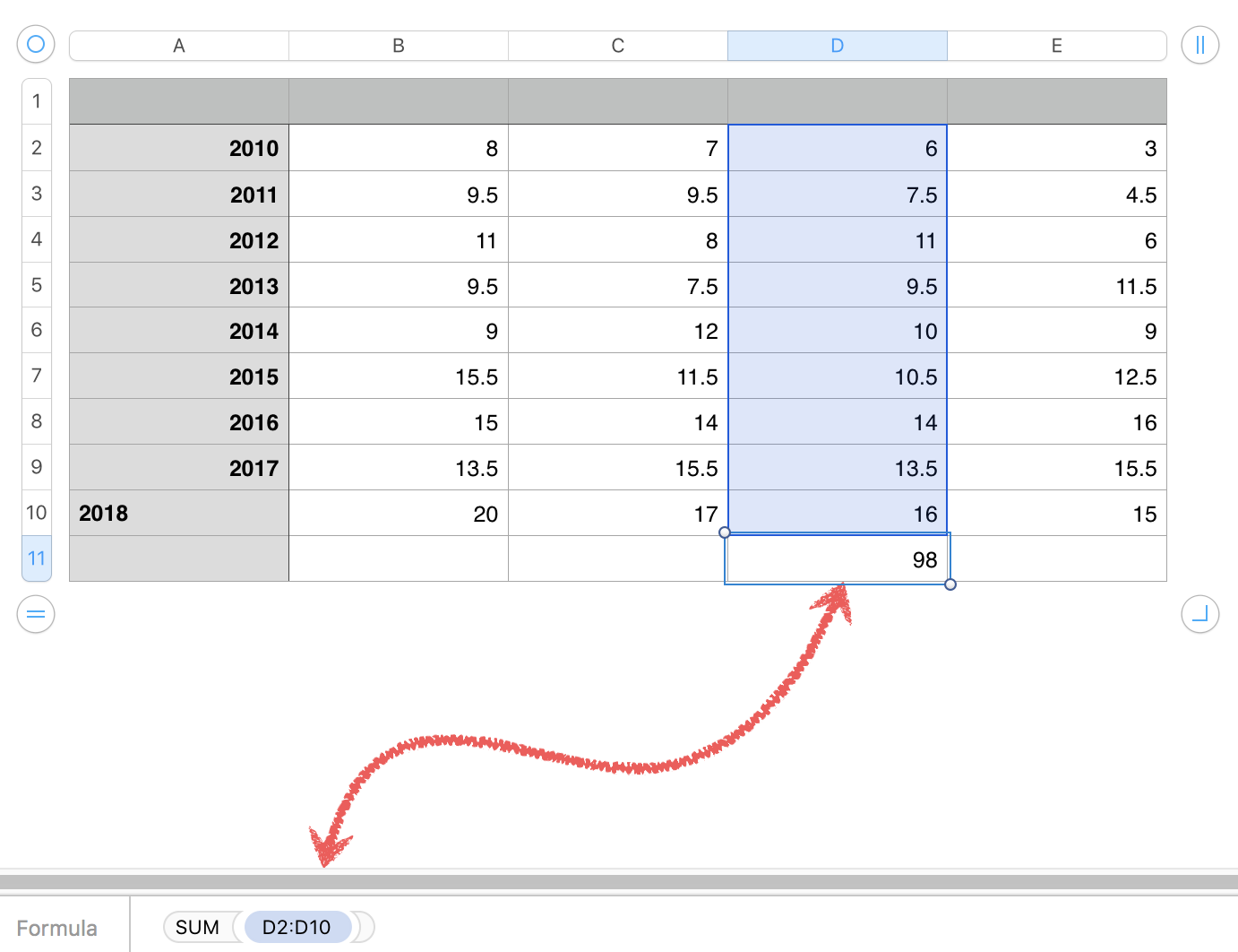 I want to SUM the numbers in this column, so I will drag the SUM lozenge indicated by the lower end arrowhead up, and drop it into the empty cell at the bottom of column D.