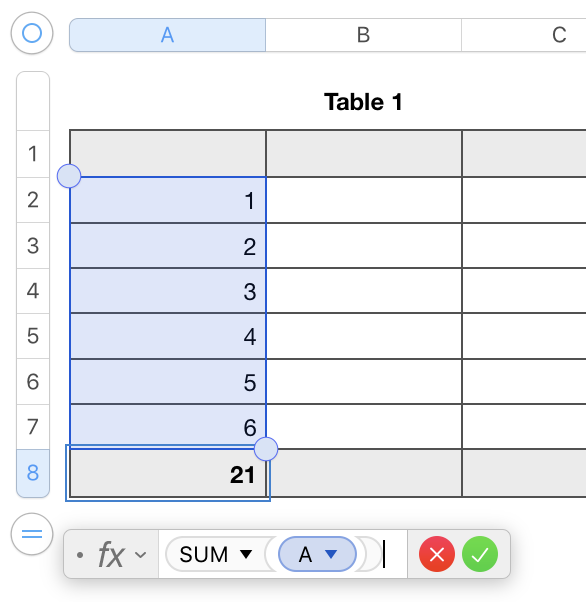 • Select the range of cells you want to include in your formula. Numbers chooses a result cell based on your selection.