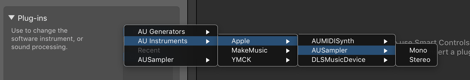 I'm attempting to load samples into Garageband 10 for Mac. Every tutorial I've found is telling me to go to Smart Controls, click the Inspector button and load instruments via AU plug in.