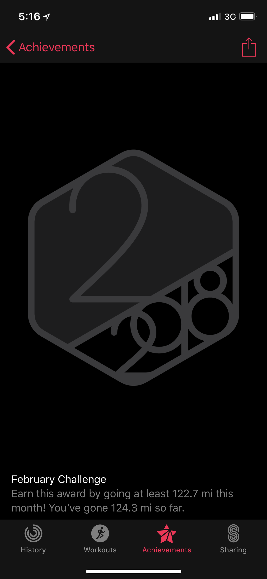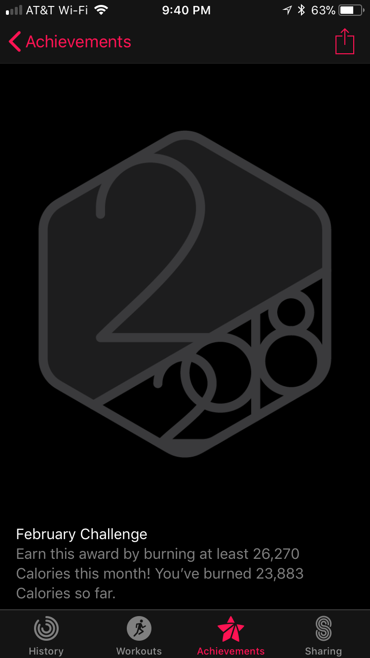 As you can see, for the month of February, I worked out a total of 84 hours and 21 minutes, or 5,061 minutes, which is WELL over the amount that was needed for my February Challenge, but due to a bug or something, the Activity app just stopped counting at 2,504 minutes. Now I have a new challenge for March, which I will try to accomplish. Hopefully I won't see this bug resurface again. (Apple, if you're looking at this, please try to get to the bottom of this bug! Thanks!)
