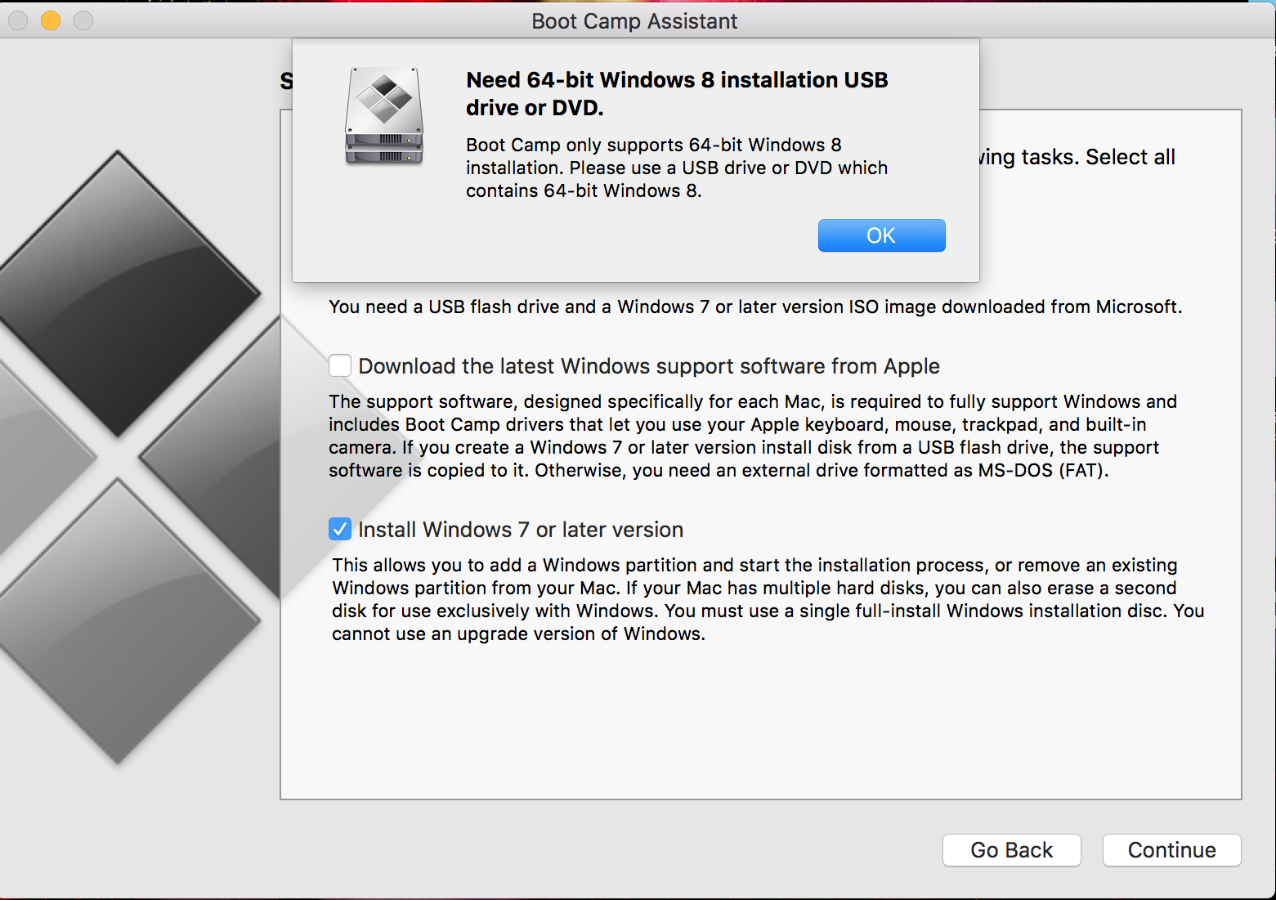 after following these steps boot camp showing different error ( Need 64 bit Windows 8 installation USB drive or DVD