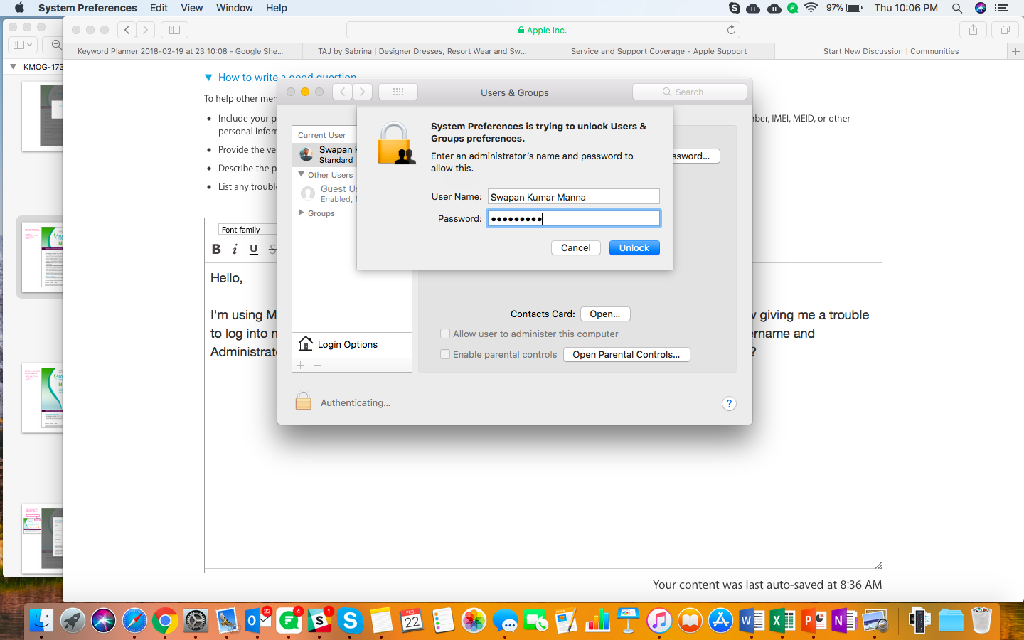 To create a new administrator account without needing any passwords, first print, copy or write down these instructions -you won't be able to access them while you're doing this procedure. Then, reboot your Mac and hold down the Command and S keys. You should see rapidly moving white text on a black screen. Once it stops moving, you should see some instructions near the bottom of the screen. Execute these commands in order, very carefully: