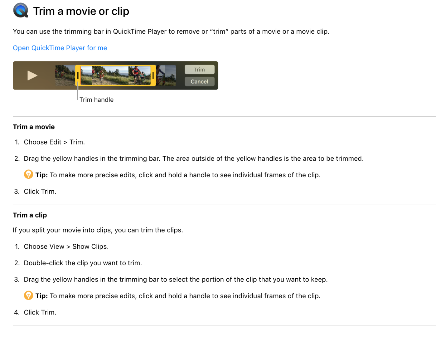 I have used QuickTime player to trim a set of movies into shorter segments and saved each of these segments as new videos. However when I go to import them into iMovie it imports the whole movie from which the clip was taken.