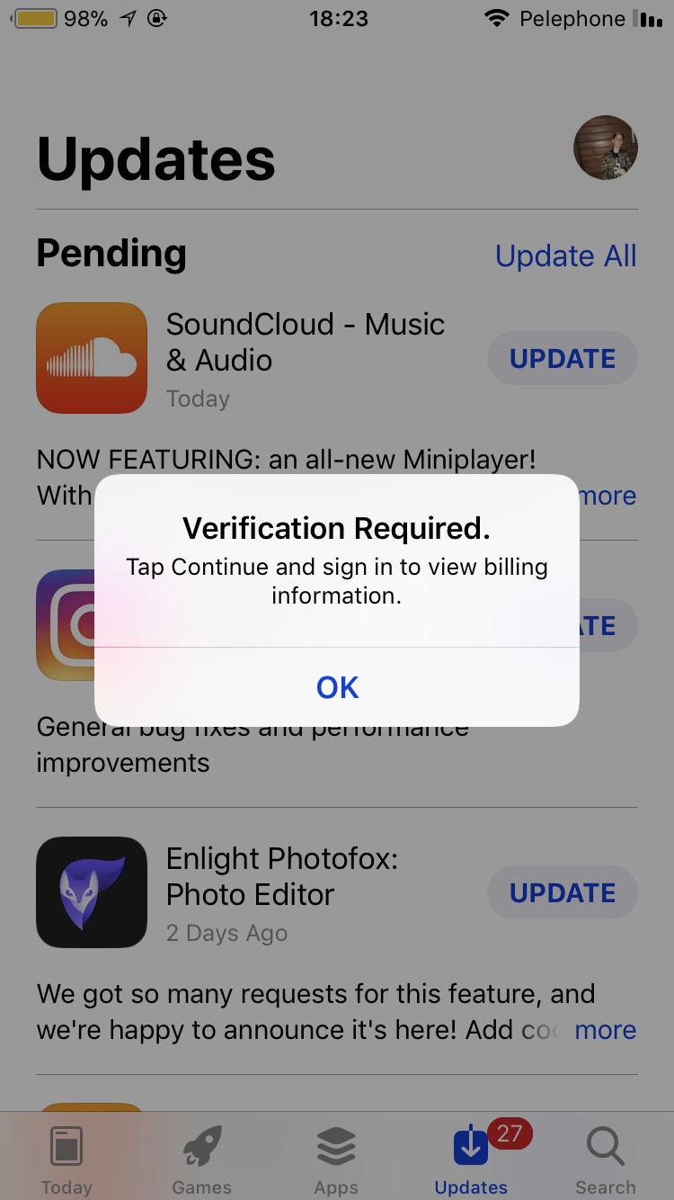 I have the same problem. When I try to update my apps it keeps saying that "tap continue and sign in to view billing information". But I have changed my billing information and even when it appears that there is no problem with the billing, that pop up keeps appearing and don't let me update the apps.