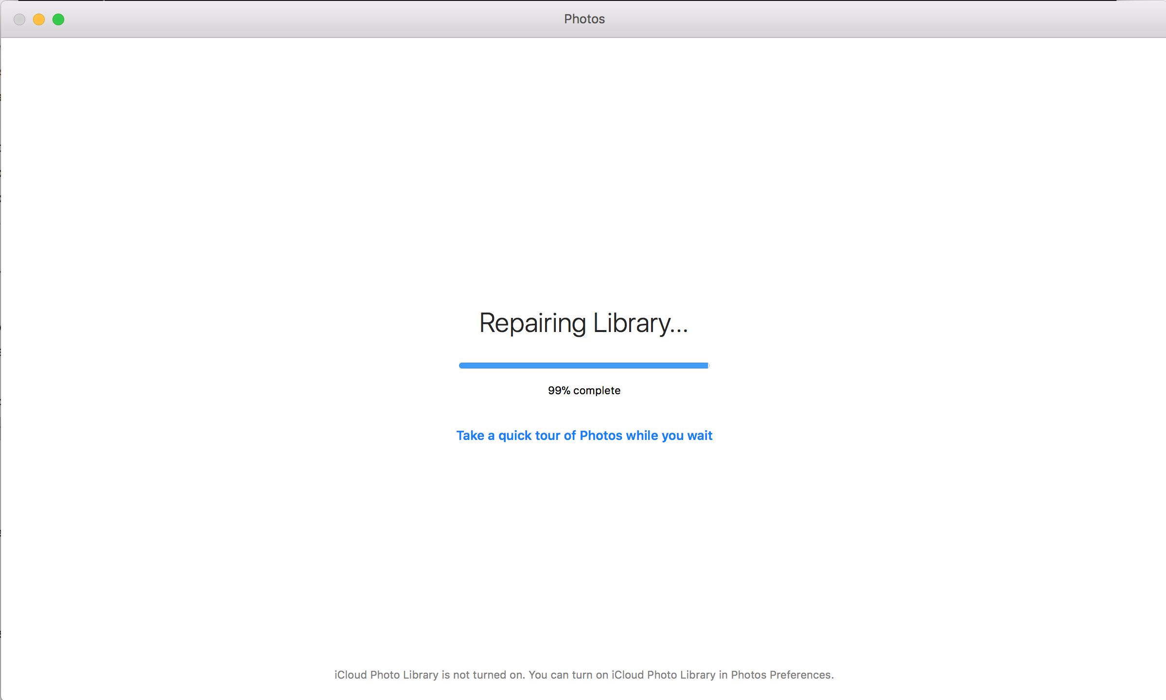 Whenever I open the photo app on my MBP, it says the database has some problems and needs to be repaired, and when I press the repair button, it runs and it stuck at 99% for over 24 hours. I force quitted and reopen the app, it still the same and it also stuck at 99% in the repair phase.