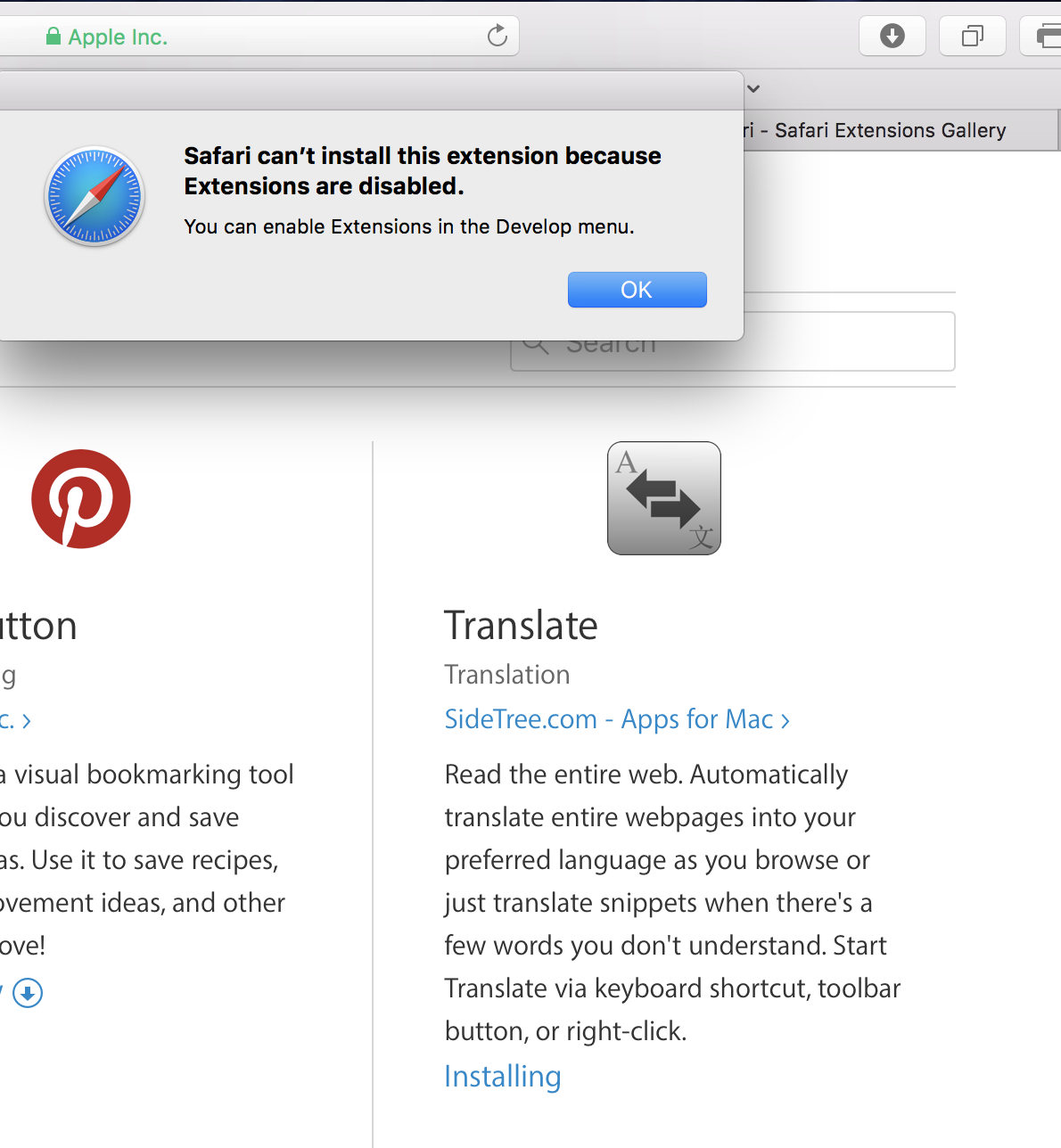 I can't add any extensions because they are disabled. Safari preferences tells me I can enable them via the Develop menu. Issue is, no matter how many times I click it, the "Disable Extensions" won't uncheck. I've tried restarting both the application and my computer. Not sure what the next step is. Please advise.