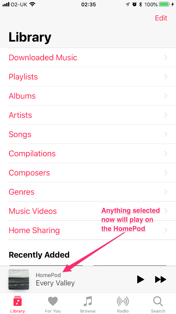 I have Apple Music at the moment so I see the full iCloud Music library whether I'm looking at it on my iPhone or my HomePod but presumably if you only have purchased content available to the HomePod then that is what you would be able to see if you browse the library in the last view. The Now Playing screen can be used to control volume, play, pause, skip, rewind, and if you slide it up control shuffle and repeat.
