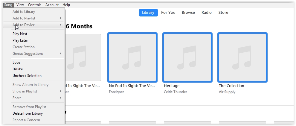 While in iTunes, I selected three albums from my Library, but the option to "Add to Device" is not available.