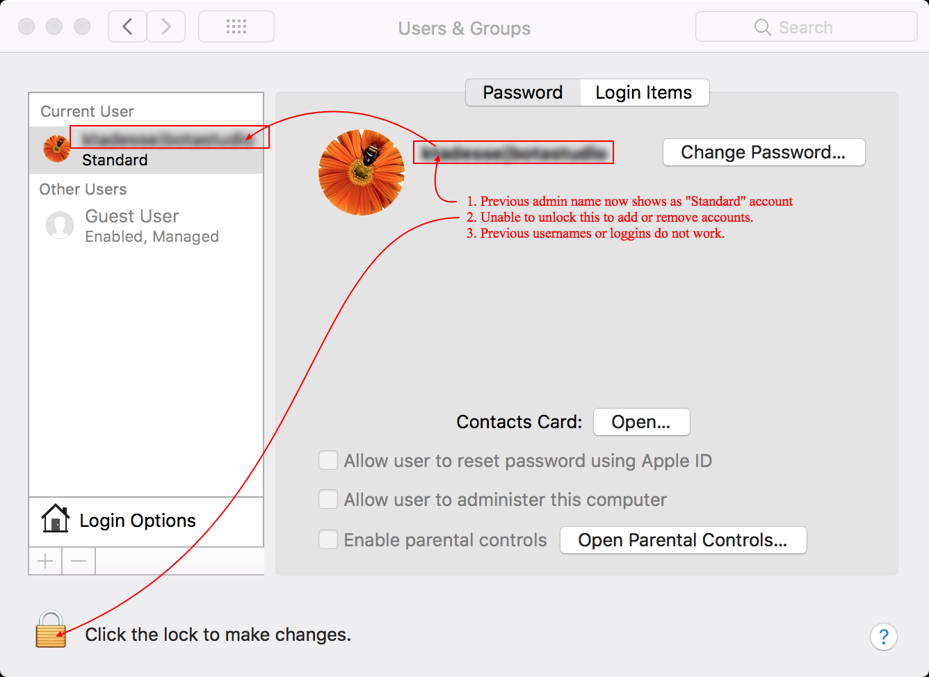 When it completes, log in under that new account. Use System Preferences to change your normal account to "Allow user to administer this computer". Log out, log in under your normal account and verify you can use it without restriction.