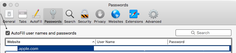Open safari and its preferences > click on password > enter the admin password you can see this screen shot just tap once on the site address the whole bar will be highlighted and Apple ID password is visible .