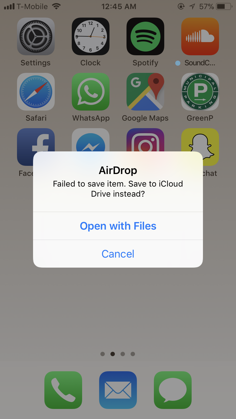 On my iPhone, I get this error why I try to airdrop. The video is 100MB and I have about 9GB free space.