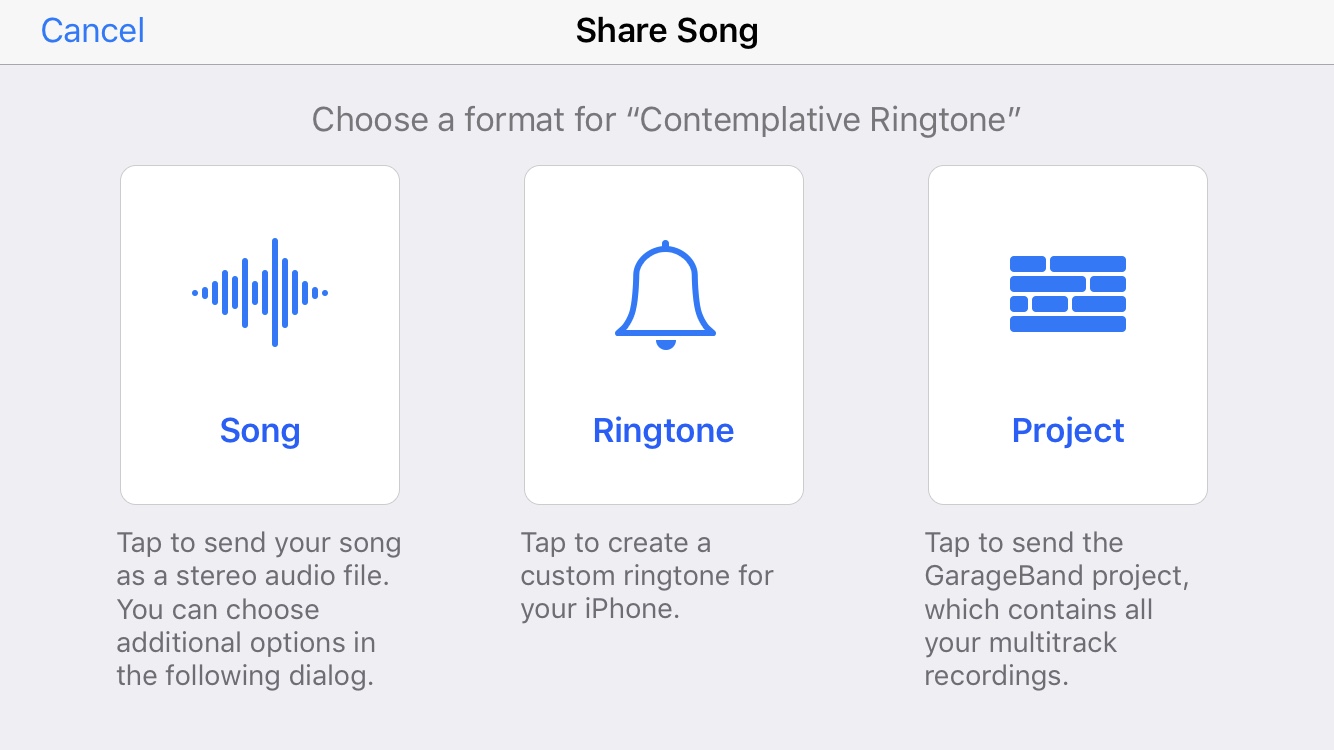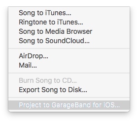 2) Once you've followed how to create a ringtone-configured project in GarageBand for Mac, use the Share menu and select 'Project to GarageBand for iOS'