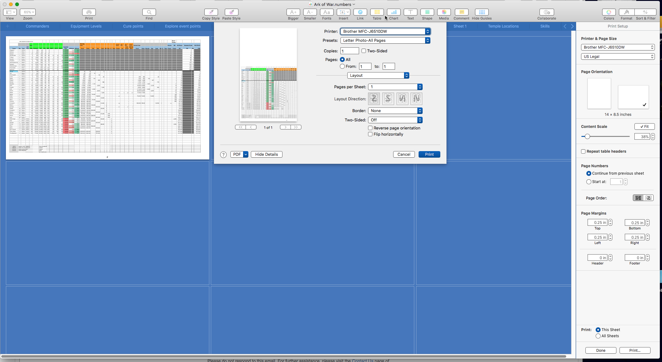 Apple Numbers won't print landscape