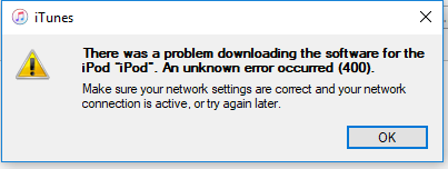 Then the update fails saying "There was a problem downloading the software for the iPod "iPod". An unknown error occurred (400). "