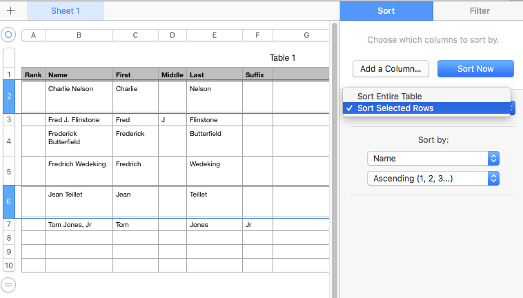 In Numbers you can easily achieve the same thing! It's just a little different. Select the cells you want to sort and (with them selected) move your mouse (or trackpad equivalent) slightly until they "lift up." Keeping the mouse button down just drag them onto the canvas of the sheet and release. They will automatically form a new table. Sort that table as wanted. Then select the sorted cells and just drag them back into position in the original table. Done in a few seconds.