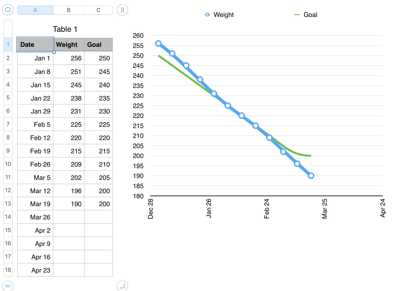 The data table contains the date in column A, the measured weight on that date (in pounds) in column B, and the goal weight for that date in column C.