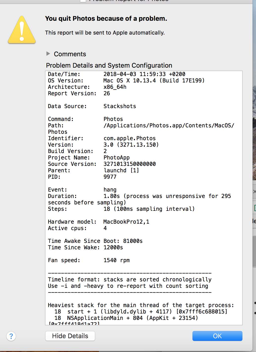 I have been migrating and merging my old iphoto libraries into one big photos library. I have separated all videos into a separate library. The library is now approaching 100gb in pictures. The problem is a lot of albums were imported so I tried to put them into a folder but got the spinning rainbow wheel forever. I can scroll fine through the photos, but every time I open or move an album I get the spinning wheel. Any suggestions? I am using the latest version of Photos. I have had to force quit photos twice now - here is the error log.